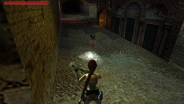 Kill the soldier (6) lurking inside on the right. Get the revolver ammo (9) he drops. Then roll to face the left side of the alcove. If you didn't meet it earlier in the alcove with secret #1, a giant beetle (5) will fly up from below. (Again, this enemy may be invisible in the patched PC version of the classic game, but it can still hurt Lara. Fortunately, she'll still aim at it so you can shoot it.) Grab the large medipack (10) sitting in the left corner. (If you killed the soldier and took the items earlier, you'll still encounter the beetle, since it only spawns after you use the lever.) Drop through the hole in the floor and slide down the ramp to the street below. The motorcycle should be parked here where you left it. (screenshots)