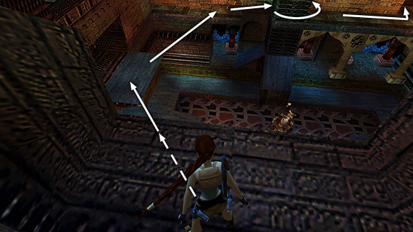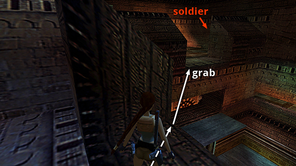 NOTE: It's possible to take a carefully angled running jump from this alcove to grab the edge of the alcove on the left (south) side of the room. (screenshot) If you manage to do this, you'll need to kill a soldier inside the alcove on the right. Then you can take the revolver ammo he drops and a large medipack on the other side of the alcove. After that, safety drop onto the gray ledge below and make your way back up to the lever. If you don't have the patience for this, it's no problem. Just follow the walkthrough and you'll reach this area soon.