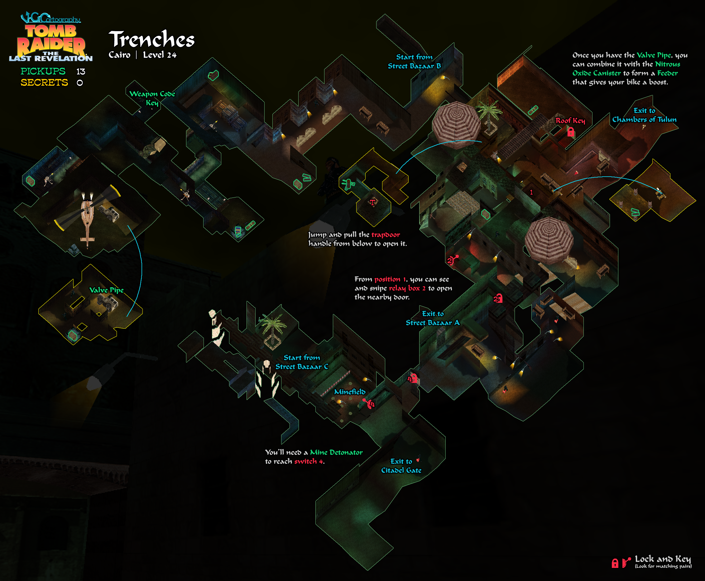 IMPORTANT: Levels 21 through 26, set in Cairo, are interconnected. Some backtracking among them is needed to find all the necessary items. This walkthrough covers what I hope is the most direct route including all kills, pick-ups, and secrets. I have also included a CAIRO FLOWCHART outlining the basic path through the levels. This chart contains minor spoilers, such as keys and puzzle items, so you may want to avoid it unless you get lost/confused. The walkthrough also contains notes on what to do if you missed any crucial items.