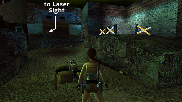 TO CITY OF THE DEAD - LASER SIGHT and/or REVOLVER: From the area in the TRENCHES near the first machine gun, crawl then run back to the west, then south, to get out of range of the gun. Follow the street back to the large palm tree. Get on the motorcycle and drive through the opening to the south into the CHAMBERS OF TULUN. At the rear door to the CHAMBERS, turn left, ride around the building, and jump the motorcycle across the deep pit on the left side. (screenshot) Then continue around to the south side of the building. Drive up the hill into the CITY OF THE DEAD. Turn left and go through the iron gate. Turn right, then left, to get back to the RUINED BUILDING WITH THE X-SHAPED WOODEN BARRICADES. (screenshot) Follow the CITY OF THE DEAD walkthrough to find the LASER SIGHT.
