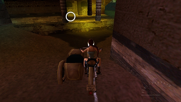 STREET WITH PALM TREE: Drive down one slope and up the next. Just ahead is a building with a low ledge and several striped columns. Stop here, dismount, and vault up onto the ledge with the columns to get some Uzi ammo (1). (screenshot) Continue eastward on foot, toward the low ledge with the big palm tree. Go through the doorway behind the palm tree into a narrow, sandy street. (screenshot)