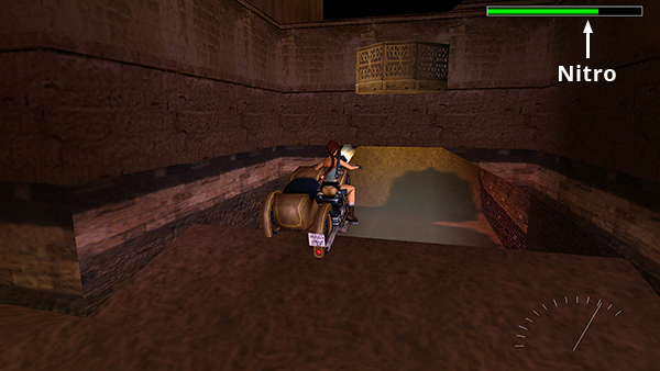 If you've already been to the CITADEL GATE level and gotten the NITROUS OXIDE CANISTER, you can now combine it with the VALVE PIPE to make the NITROUS OXIDE FEEDER. Position Lara facing the motorcycle (as though she were about to get on) and press Action, select the FEEDER from your inventory, and press Action again to attach it to the bike. (screenshot) Now when you press Sprint/Dash while driving forward, you'll get a speed boost. Just like when Lara is sprinting on foot, the sprint meter will appear at the top of the screen showing how much boost is left before you must release the button and wait for it to recharge. (screenshot)