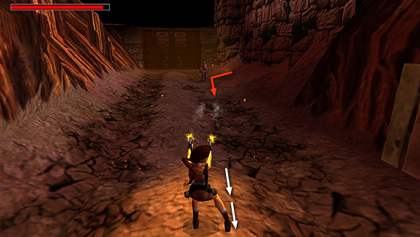 DIRT ROAD: Follow the road toward the big doors with the "Do Not Enter" signs. As you approach, 2 blue-robed baddies (1-2) emerge from a doorway on the right side of the road. If you advance gradually, you can get a lock on the first and fire with pistols while hopping away. (screenshot) He can't shoot while he's trying to follow Lara, so you won't take much damage. Then advance again and do the same with the second enemy, who drops a SILVER KEY(1). (screenshot) Use it in the keyhole to open the smaller door on the right side of the road. (screenshot)