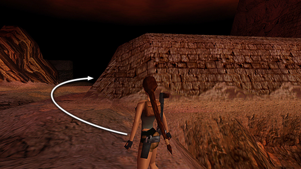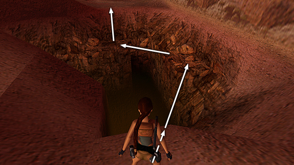 Now you're back at the metal door where you entered from the WALLED EXCAVATION AREA. Approach the angled edge on the left side of the next pit. Slide or jump down onto the ledge below. (screenshot) Take a running jump to the next ledge (also on the left side of the pit). Turn right and take a running jump to the ledge in the southwest corner. Turn left, walk to the bottom of the slope, and take a standing jump out of the pit. (screenshot)