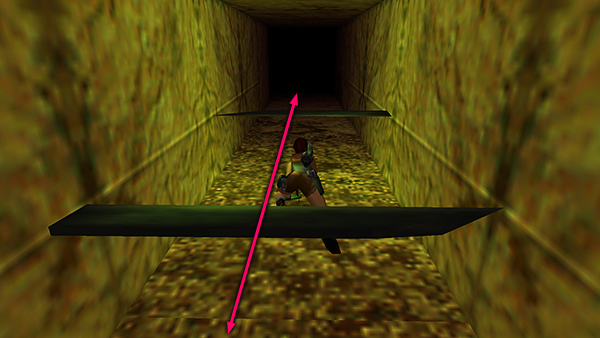 HALL WITH SWINGING BLADES: Head down the ramp, killing a bat (1) as you go. To get through the first swinging blade, position Lara at either side and run past the blade as it starts to swing away. (screenshot) Repeat the process for the second blade, then kill 2 more bats (2-3) in the room beyond. (screenshot)