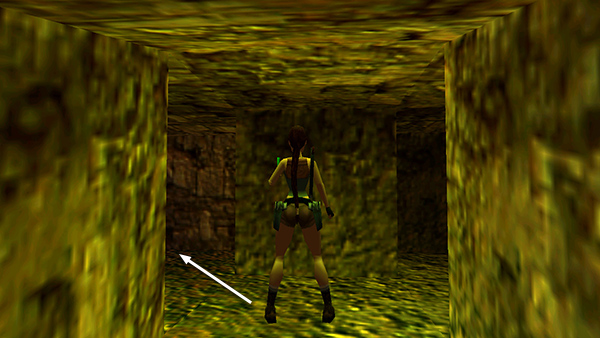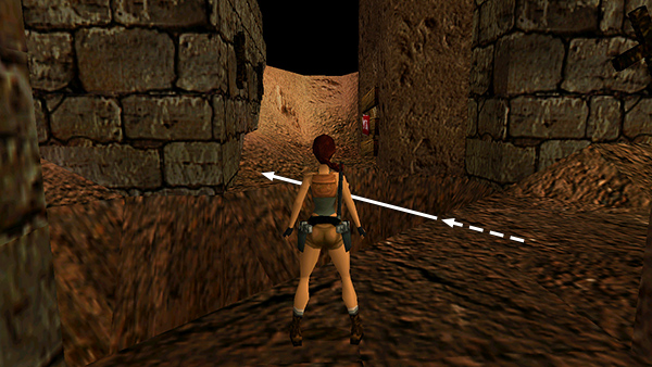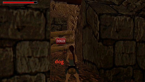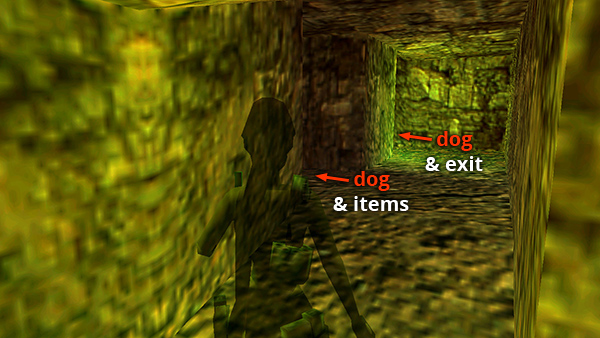 Return along the passage to the fork. This time, go right (north). Just ahead the passage jogs to the left. Beyond that, two separate passageways lead off to the left, each with a wild dog inside. (screenshot) I'd suggest running forward and taking the second left, killing the first dog (27), then backtracking to the other side passage. Kill the second dog (28) as it comes down the stairs toward you. Then go to the top and pick up a large medipack and revolver ammo (8-9) to the left and right (green dots on map). Return to the intersection and turn left, then left again. Continue to an opening where you can climb up.