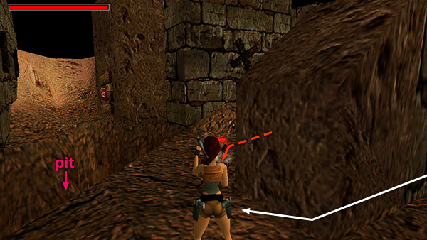 (14) NORTHEAST CENTRAL MASTABA: Kill a black scorpion (47) in the ruined building. Exit and kill another scorpion (48) outside. Turn left and walk forward along the edge of the excavation pit. Take a running jump across the pit to the left (north) rim, pressing the Left direction button in-flight if necessary to land the jump. Turn right and move to the edge so Lara is facing south across the pit. Take a running jump to grab the left side of the far edge. Pull up. (screenshots)