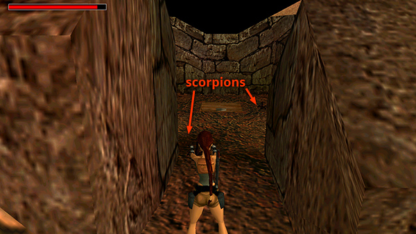 (15) SOUTHEAST CENTRAL MASTABA: Open the door of the building on the right (southwest), enter and kill 2 bats (49-50). Open the trapdoor and drop down into the tunnel. You might want to walk along this tunnel with pistols drawn, since Lara can probably see better than you do. You'll encounter 3 black scorpions as you go: The first scorpion (51) is just inside the tunnel. Turn left (north) at the first and only intersection. Continue to another scorpion (52) and, a little farther on, some revolver ammo (15) (green dot on map). Follow the tunnel back to the intersection, then go left (east). Kill another scorpion (53) and continue to an opening where you can climb out into another ruined mastaba.