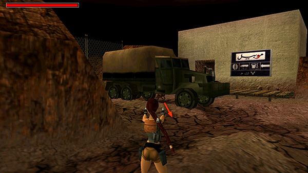 (3) NORTHWEST MASTABA: Head back the way you came and go between the two buildings where the first dog emerged. Approach the door of the building on the left and press Action to kick it open. Enter and pick up revolver ammo (3) in one corner (green dot on map). The trapdoor in this room is much more obvious. Stand near the handle and press Action to open it. Drop into the tunnel, advance a few steps, and kill a wild dog (5) that approaches from around the next corner. The shotgun works well in close quarters. Just ahead, the tunnel slopes upward, takes a turn to the right, then straightens out. When you pass this point, 2 more dogs (6-7) charge up the stairs toward you. Shoot them and continue to the room below. (screenshots)