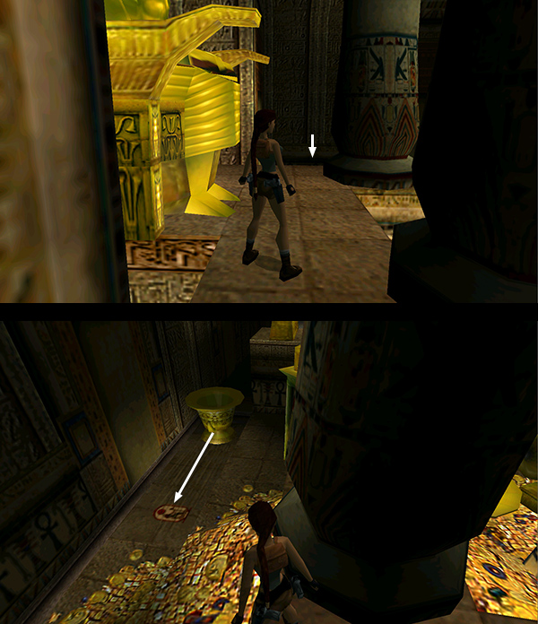 FIRST TREASURE ROOM: The jackals on either side of the entrance look suspicious, but they don't come to life...yet. Run up the ramp about halfway. Then climb onto either of the side walls. In the low, dark areas behind these walls, you'll find a large medipack, wideshot shells, a small medipack, and normal arrows for the CROSSBOW (7-10), which you don't have yet. (screenshots)