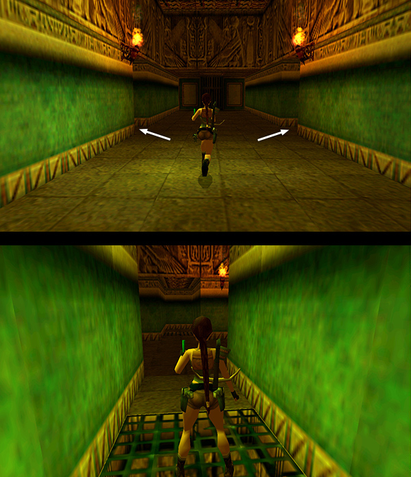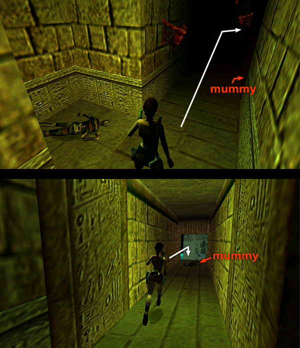 Walk to the edge of the block and take a standing jump to grab the small opening high on the south wall. (screenshot) Press Duck/Crouch + Up to crawl in. Crawl through until Lara can stand. Light a flare if you like, then continue down the hall past two alcoves containing sleeping mummies. As you round the next bend these mummies, along with a third mummy lying in the passageway ahead, come alive. You can't kill them with the weapons you have, so just run toward the light at the end of the hall. (screenshot) Once you drop down into the next room, they won't follow.