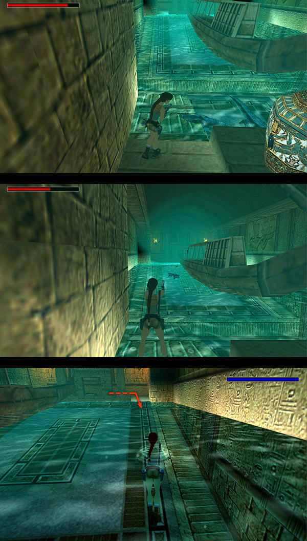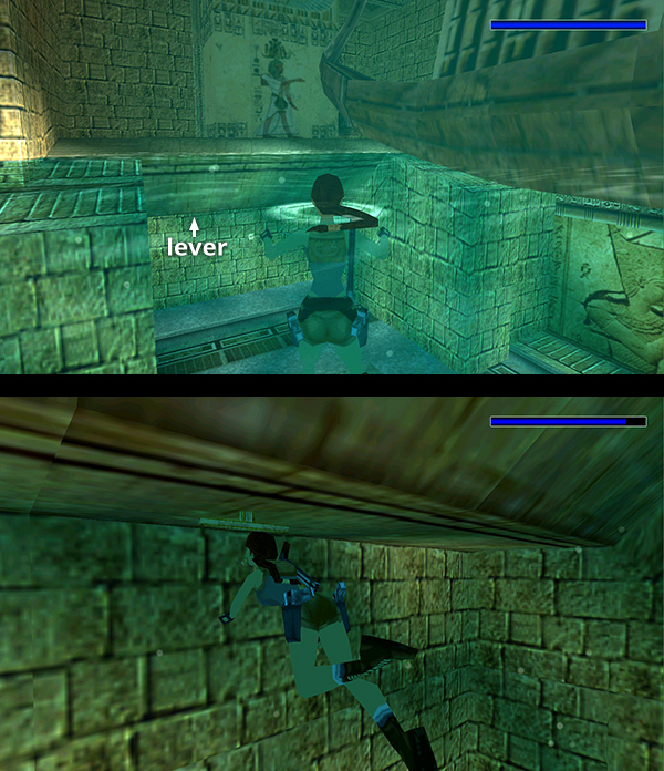 Swim down underneath the painted wall on the east side of the pool, below the entrance. On the underside of the ledge is a lever. Position Lara below it and press Action to pull it. (screenshots) This opens a gate on the other side of the pool. Swim across, climb out of the water, jump to grab the edge of the opening and pull up. (screenshots) Follow the passageway to the next room.