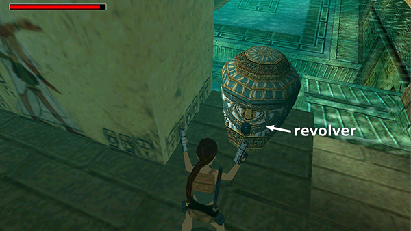 POOL: Now you've got a new problem: the 4 crocodiles (10-13) in the pool. Two attack immediately. Kill them with shotgun or pistols. (If you have run out of normal shotgun ammo, you can switch to wideshot ammo in the inventory screen.) The third and fourth crocodiles swim toward you from the far side of the pool. You may need to swim out a ways to lure the last one toward you. Then climb out of the water to kill it. (screenshots) When the coast is clear, shoot the ceramic vase on the right (when facing the pool). Inside you'll find the loaded REVOLVER (13). (screenshot) The left vase is empty.