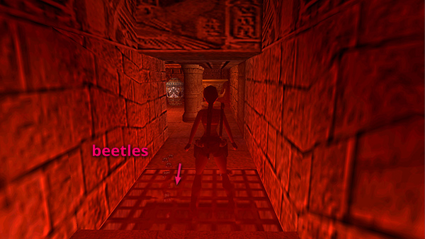 MASK ROOM AND BEETLE ROOM: Approach the pedestal at the top of the wide steps. As you do, the gate on the right (north) side of the room opens. Press Action to take THE GOLD MASK (20) from the pedestal. (screenshot) Then go through the gate and follow the passageway around to the right. (screenshot) When Lara passes through the next gate, it closes behind her and another swarm of beetles attacks. Run/jump up the stairs and into either of the alcoves about halfway along the hallway. Stand on the grate and the beetles will follow and fall through the holes. (screenshots) You may have to run out then back to the grate to lure all of them into the pit.