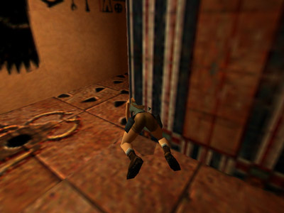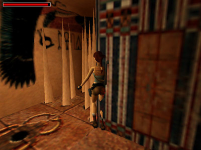 You can't see the spikes because they're behind Lara, but as she jumps, you'll see her get hung up inside the corner and sort of "hover" for a moment (as shown above). At this point, you'll hear the telltale "ching", indicating that a set of spikes has been triggered. When you've set off all three sets, the hallway is safe to pass.