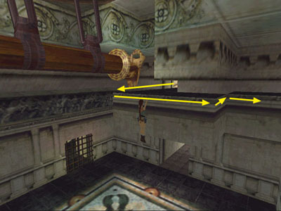 This room contains widely spaced ledges and a crate dangling from a winch. Here Lara tells you how to do a running jump and grab to get from one ledge to the next. Do the jump then follow the elevated walkway around to the end. Side flip to the left (or just jump) onto the next ledge. Continue forward through the doorway back to the dangling-crate room. Jump straight up to grab the overhead bars and monkey swing across the room. Climb the ladder on the wall almost to the top, then climb around the corner to the right and let go. Crawl through the low opening. At the end, turn right and back up to the edge. Press Action and reverse to make Lara lower herself to the floor. Or, a new TR5 move: crawl forward to the edge of the opening then press Jump to somersault out of the opening.