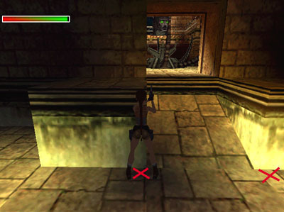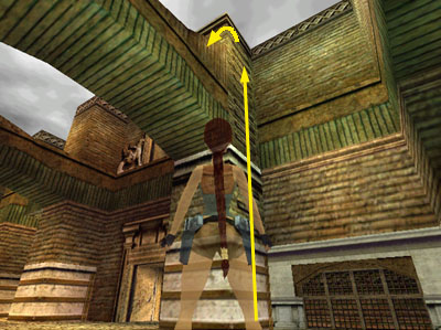 NOTE: To set up this jump, walk Lara to the corner of the ledge nearest the opening where you want her to land. Angle Lara toward the opening then take one hop plus one walking step back. This will give Lara enough of a run-up. If she takes the running jump with only a hop back, she'll pause at the crack between the flat and sloping parts of the ledge and end up doing a standing jump instead. This will cause her to miss the opening and fall. The extra step backward will also make it so you don't need to press Action while jumping in order to land in the opening.