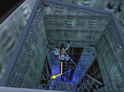 Again crawl backwards to hang from the edge of the shaft. Traverse around to the left and climb out. Climb the nearby ladder. Ahead you can glimpse the control room through the slats. Crawl through the low passageway.
