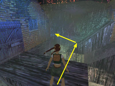 MILL POND AND SHACKS: When you surface in the pond, face the building with the wooden walkway jutting out and swim to the left. (If you swim to the right, a swarm of rats appears.) Climb out on either of the flat rock ledges and jump/walk over to the wooden walkway.