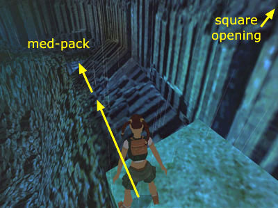 Drop down to the floor of the CHASM. Go around the back of the rock outcropping (to the right if Lara's back is to the MISTY CAVE.) There's a small medipack (3) on the ground. Now make your way to the other side of the chasm, where there's a square ledge below an opening in the wall.