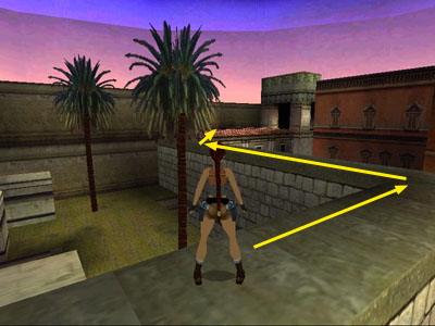 Follow the L-shaped wall around to the far end. Take a running jump to the orange-tiled roof ahead.
