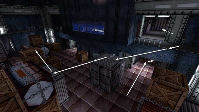 Turn around (to face away from the locker) and run forward, along the right side of the large stack of crates in the middle of the room then on toward the big roll-up doors on the far wall. When you reach the far wall, turn right, then move behind another stack of crates into the doorway. Use the SILVER KEY in the keyhole set into the left door to open it. (screenshots)
