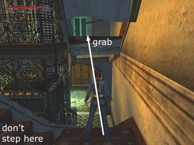 NOTE: If you don't mind cheating just a little, you can prevent the police from entering by not stepping on the area of floor that triggers them. From the entrance, go up the stairs just to the first landing. Instead of continuing upstairs, turn around to face the entrance. Then jump forward to grab the edge of the opening above the stairs (as shown in this screenshot). Pull up, turn around and jump across the hole in the stairs. Now pick up the walkthrough in the middle of the next paragraph.