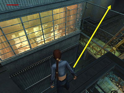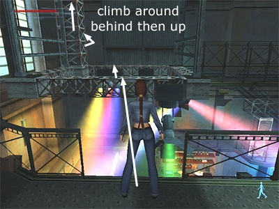Move to the break in the railing near the lighting rig that's moving up and down and walk to the edge. Then, when the lighting rig reaches its lowest point, jump onto it. Activating walk mode before you jump will keep Lara from falling off when she lands and help her maneuver on the narrow bars. Jump across the gap to the other side of the moving rig. (Don't grab or Lara will fall short.) Climb onto the framework in the far left corner. Climb around to the back and then up to the top of the structure. (This screenshot shows where to jump and climb.)