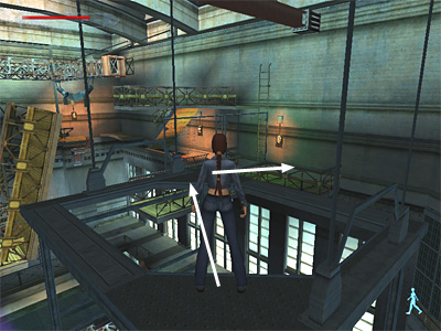 The following jump is a little tricky, so you might want to save your game first and/or use the alternate path, described in the note below. Instead of jumping across to the opposite corner of the lighting rig, turn to face the glassed-in LIGHTING BOOTH. Position Lara at about halfway along the edge of the rig. Turn so she faces just slightly to the left (as shown in this screenshot) and then side flip to the right to clear the fence and land at the base of the drawbridge. Positioning is key here. If Lara is too far to the right before jumping, she'll overshoot the walkway. If she's too far to the left, or not angled correctly, she'll hit the fence. After making the jump, continue with the strength upgrade below.