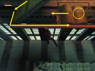 CLIMBING TO THE TOP OF THE MAIN ROOM: Whether or not you managed to get into the ticket office at this point, go up the stairs opposite the bar. Another security guard (5) comes through the door at the top. Take him out and get his M-V9 ammo (24B/23P) . Follow the walkway around the perimeter of the room. The stairs leading up are blocked, so push the movable speaker cabinet out onto the balcony. Climb onto the cabinet, step to the edge and jump straight up to grab the scaffolding above. Pull up.