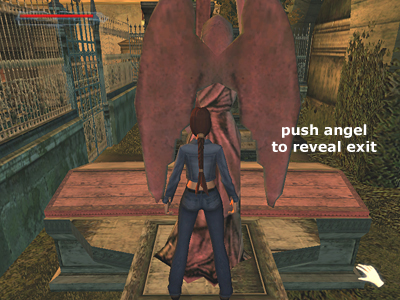 LEVEL EXIT: Climb up behind the angel statue (as shown in this screenshot) and push it over to open the way into the tunnels. (You'll need the upper-body strength upgrade to do this as well.) Drop into the hole to enter the next level.