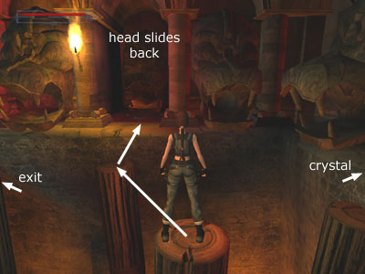Then make your way back across the logs to the entrance. I found it easier to jump from the log that triggered the movement of the head back to the left (nearer to where you got the crystal) and then across the logs on the other side of the room.