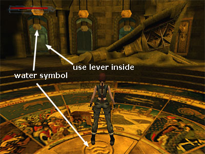 Swim down, then forward through a room with some fish swimming around in it. Swim into the small room ahead, avoiding the blades in the doorway. Pull the lever to raise the water level in the surrounding rooms. Swim back out past the blades and up through the hole where you came in. Climb out of the water. Return to the other room, where the fire knight is/was, and drop into the larger hole. Now that the water level is higher, Lara will splash down harmlessly.