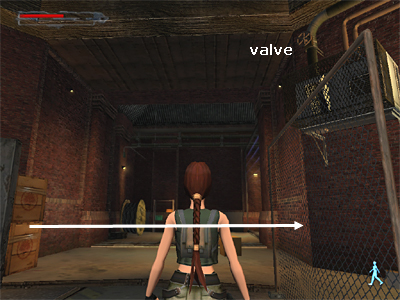 Climb onto the crate you just moved and turn to face the topmost crate in the stack. (Do not climb onto the topmost crate or jump straight upward while standing here. If you do, Lara will suffer fatal steam burns.) Pull the topmost crate toward the fence as far as it will go. Again, you won't be able to move it all the way with Lara standing there. Pull it several times to gradually inch it toward the fence.