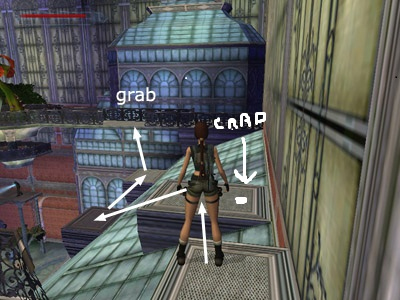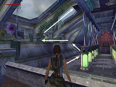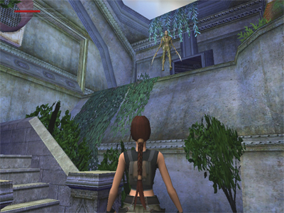 USEFUL BUG: To deal with the clawed mutant you encounter in the second greenhouse, run to the far end of the room and go up either set of stairs onto one of the ledges spanning the length of the room. Stand in any of the spots where the ledge juts out in a little semi-circular planter, or where the greenery texture grows out over the edge of the ledge. The best spots seem to be near the end of each long ledge where the greenery grows out and down the slope. Wait for the mutant to follow Lara. Then just before it reaches her, turn to face out over the room, step off the edge and slide down to the floor. If the bug works, the mutant will try to follow Lara but end up walking in mid-air, as shown in this screenshot. The mutant seems to imitate Lara, but it can't manage to slide as she does. So do not jump off the ledge, or the mutant will most likely jump down too. You may need to try this a few times in different places to make it work, but once the mutant is stuck, it will stay in that spot while you explore at your leisure. Special thanks to Peder for this strategy.