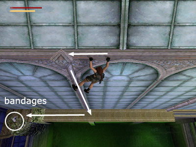 If you miss any of these jumps, try to land on the roof facing uphill. Then slide down the roof and press Action to grab the edge. Traverse to the left or right, depending on where you slip, and climb down the vertical support column on the front of the greenhouse. Walk along the narrow ledge to the corner and pick up the bandages (17) (shown in this screenshot). Jump into the pool, swim to the steps and climb out. Then retrace your steps up the ladder and stairs to the blocks to try again. You may even want to do this once on purpose just to get the pickup.