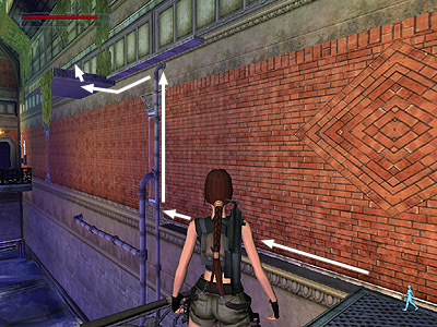 The big door at the far end of the room doesn't open. You'll have to find another way out. But first get a few useful items: There are bandages (6) in the bushes between the stairs and the sloping ledge to the right of the entrance (when facing it) and ammo on the ledges spanning the length of the room. First, go to the far end of the room and up the set of stairs on the right. Follow the ledge back toward the entrance. At the very end you'll find a Mag clip (7). Slide down to the ground and run back along the length of the room to the far left corner. Go up the steps. Follow the ledge back toward the entrance, picking up one Mag clip (8) near the middle and another Mag clip (9) near the end. Backtrack along the ledge to the middle and jump straight up to grab the silver drainpipe. Monkey swing up the pipe to the top and drop onto a narrow platform. (The path from the entrance to the drainpipe is shown in this screenshot.)