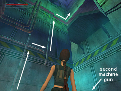 Climb over the stacked crates near the valve and cross the room to the wall behind the second gun. Climb the pipes on the far wall, following the path shown in this screenshot: Climb up, right, then up again. When you reach the narrow ledge, traverse along it to the right and around the corner. Then drop onto the jutting ledge in front of the open doorway. (If you run out of strength, you can pull up onto the ledge as soon as Lara rounds the corner and then drop down near the doorway.)