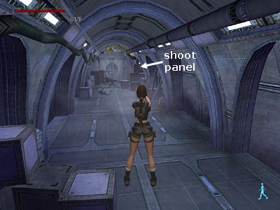 Alternatively, commando crawl across the room. The guns will start firing but won't be able to hit Lara if she's hugging the floor. Crawl all the way to the far corner to the left of the door before standing up. The guns can't "see" Lara in this corner. Carefully sidestep toward the button but don't step out too far. Press it and run through the door. (Thanks to Ingrid and others for this strategy.)