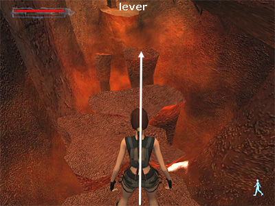LAVA PIT WITH LEVER & WOODEN WALKWAY: Follow the passage. Where it splits, go to the right to a slope above a lava pit. You can't get the large health pack behind the bars just now. Slide down the slope and jump to land on the stone platform in the middle of the lava pit. The jump to the next pillar is a bit tricky. The short hop is hard to control on uneven surfaces. So instead position Lara several steps back from the edge, just behind the gap between the first and second pillars that make up this platform (as shown in this screenshot). Then take a standing jump to the next freestanding pillar. Walk to the edge and jump to the ledge with the lever. For some bizarre reason, the final jump gives Lara a lower-body strength upgrade. This upgrade also gives Lara the ability to do a special sprinting jump, which will be very useful shortly.