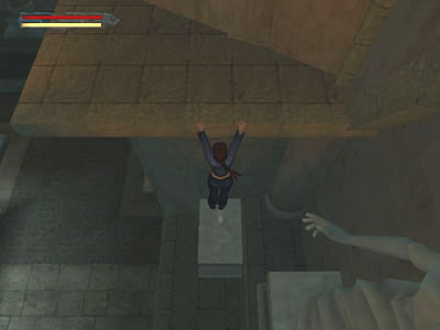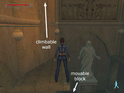 Return to the ledge above the movable block and this time climb up the wall with the uneven brickwork.