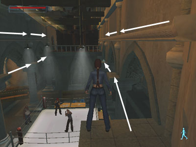 From that ledge you can grab the carved molding on the right and traverse along above the archways. When you reach the first small ledge, drop down to recharge Lara's grab meter. Then traverse to the next small ledge and get the small medipack.