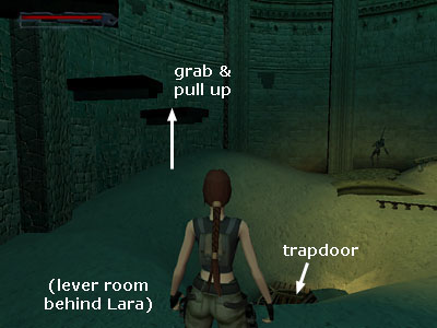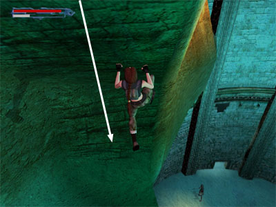 From the end of the broken bridge, take a carefully angled running jump to grab the small ledge with no gargoyle located between the two ledges that do have gargoyles. Pull up. Turn left, walk to the edge of the ledge and take a standing jump to grab the next ledge with the gargoyle. Lara won't shimmy all the way around, so pull up, drop and hang off the front of the ledge and shimmy around to the far side. Drop to the sandy ledge below.