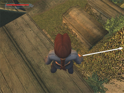Once on top of the crypt, save your game. You'll need to make a tricky jump over the wall into the courtyard. If the jump is even a little short, she won't clear the wall and will either land back inside the graveyard or on top of the deadly spikes. This screenshot shows the general area, but this is not the spot from which Lara should jump.