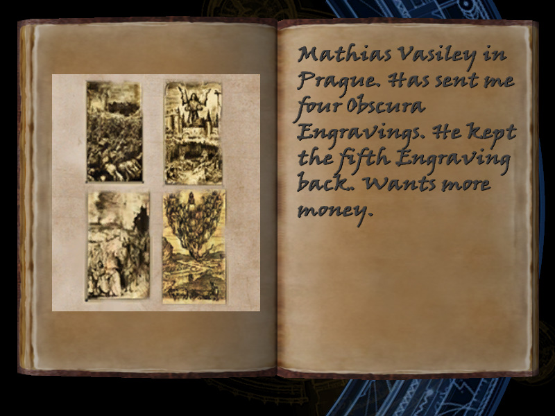 | 7/53 | (41) Mathias Vasiley in Prague. Has sent me four Obscura Engravings. He kept the fifth Engraving back. Wants more money. [includes image] | Margot Carvier's Apartment | screenshot | |