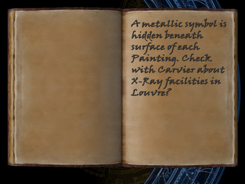 | 10/53 | (44) A metallic symbol is hidden beneath surface of each painting. Check with Carvier about X-Ray facilities in Louvre? | Margot Carvier's Apartment | screenshot | |