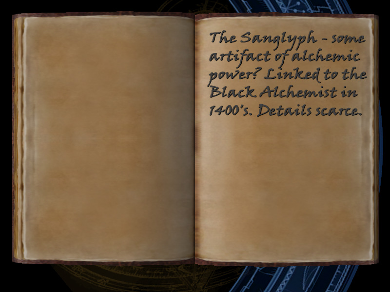 | 18/53 | (52) The Sanglyph - some artifact of alchemic power? Linked to the Black Alchemist in 1400's. Details scarce. | Margot Carvier's Apartment | screenshot | |