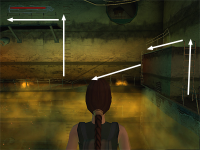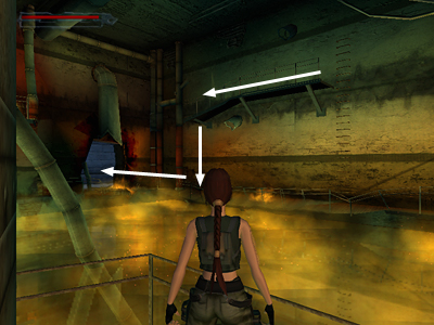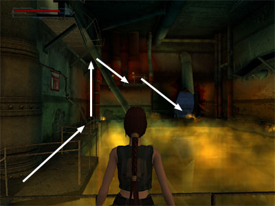 Drop from the opening above the flaming pool to the walkway below. Turn to face the pool then go to the left. Follow the walkway to the ladder, climb up and jump to the ledge in front of the left set of fuel tanks. From there, side flip to the right, taking care not to land in the fire in front of the hole in the wall.