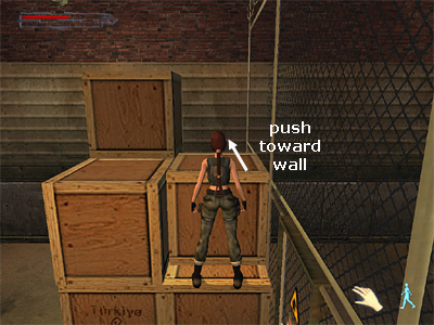Climb over the crates nearest the door in the fence. With Lara standing on the crate in the corner between the fence and the wall, turn so the fence is on Lara's left. Pull the crate in front of her toward the wall. Pull several times to move it as far as it will go. You won't be able to pull it all the way with Lara standing there, but after doing this, the crates will be arranged as shown in the screenshot below.
