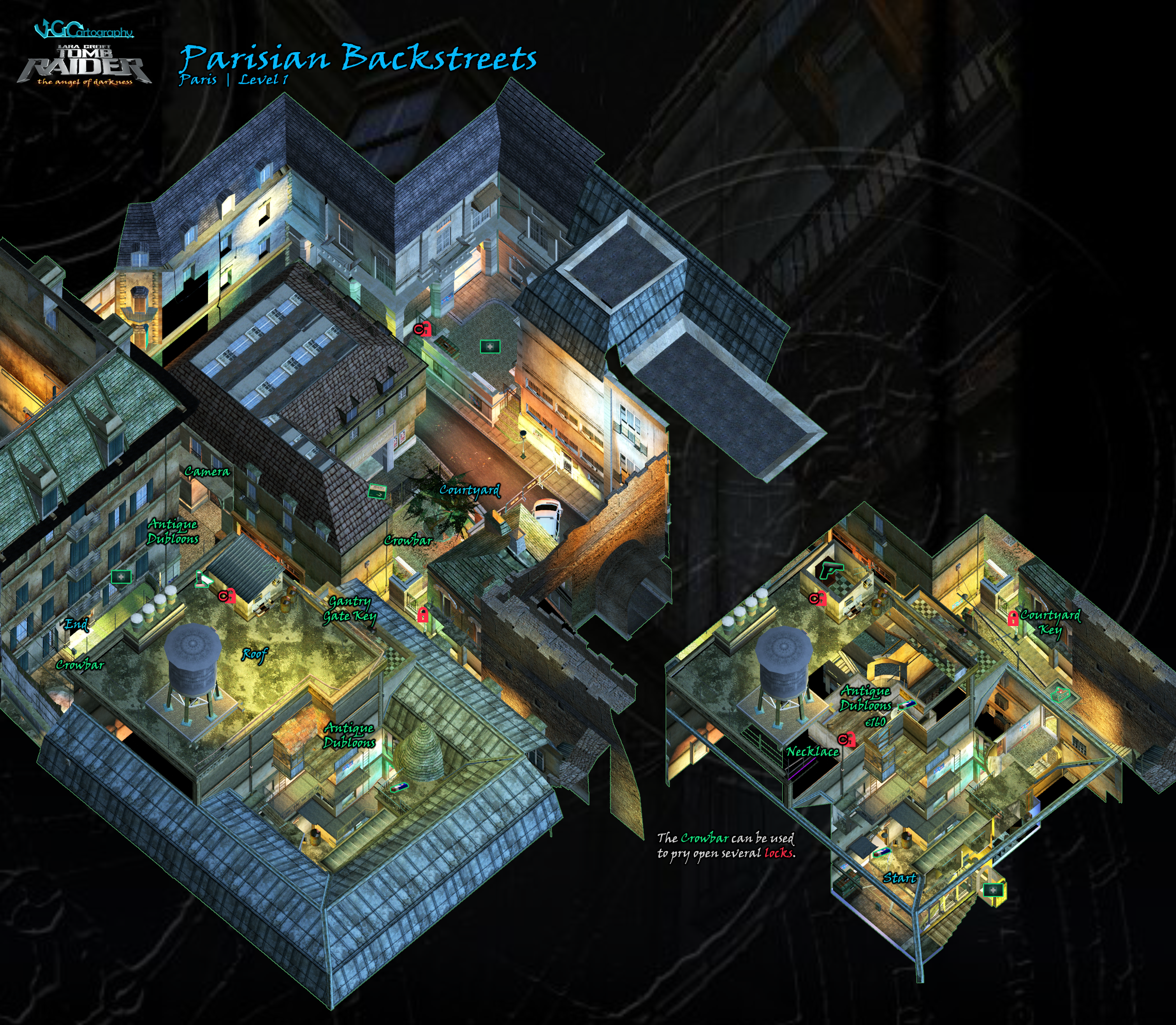 *NOTE ON LEVEL MAPS: VGCartography's Angel of Darkness maps follow a slightly different level-numbering convention than I do. You'll notice most of the Parisian Ghetto-adjacent areas on the same large map. Later, the elemental levels off the Hall of Seasons are included on the same map as the hub level. Visit VGCartography on DeviantArt and follow on Twitter/X and YouTube for more fantastic game maps.
